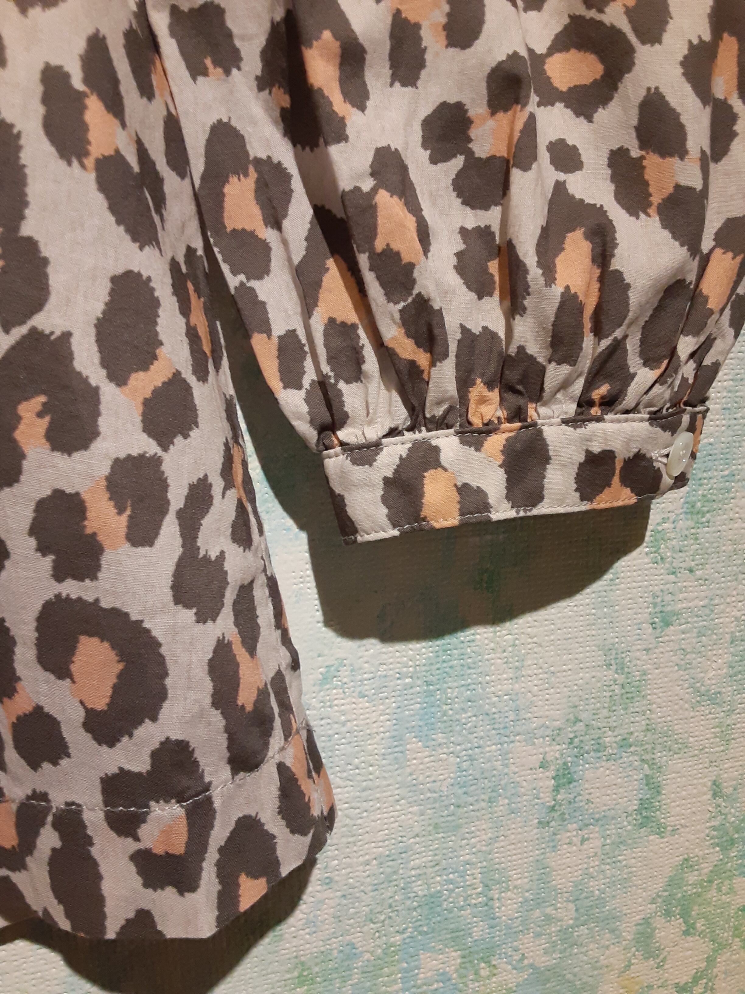 ふんわりとしたコットン やさしい色合いのヒョウ柄ブラウスは 肩 背中 袖にたっぷりの ギャザーが 入って 着心地抜群✨