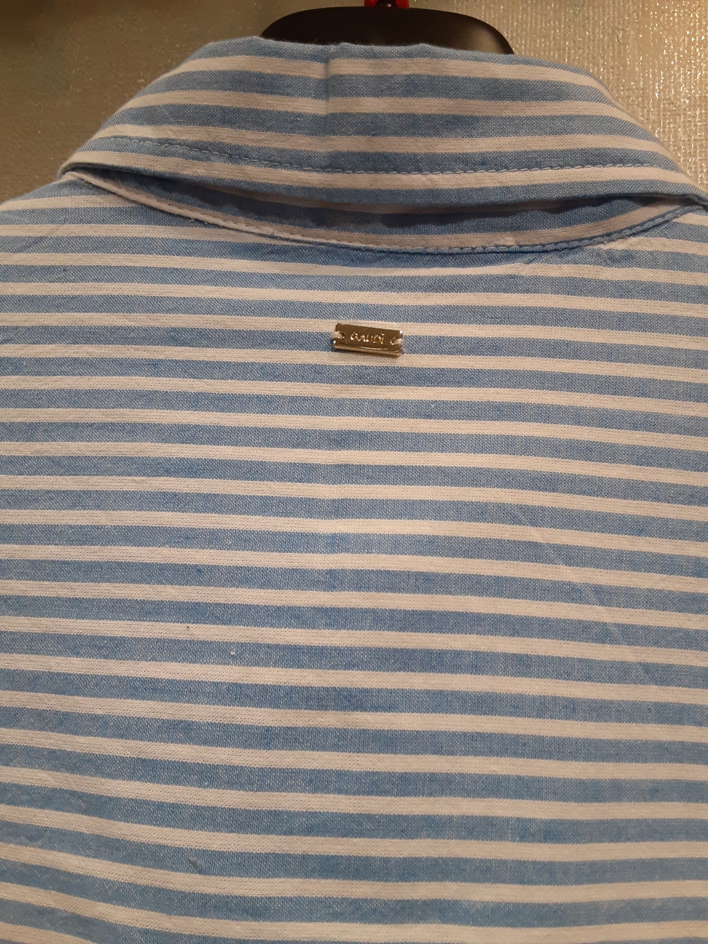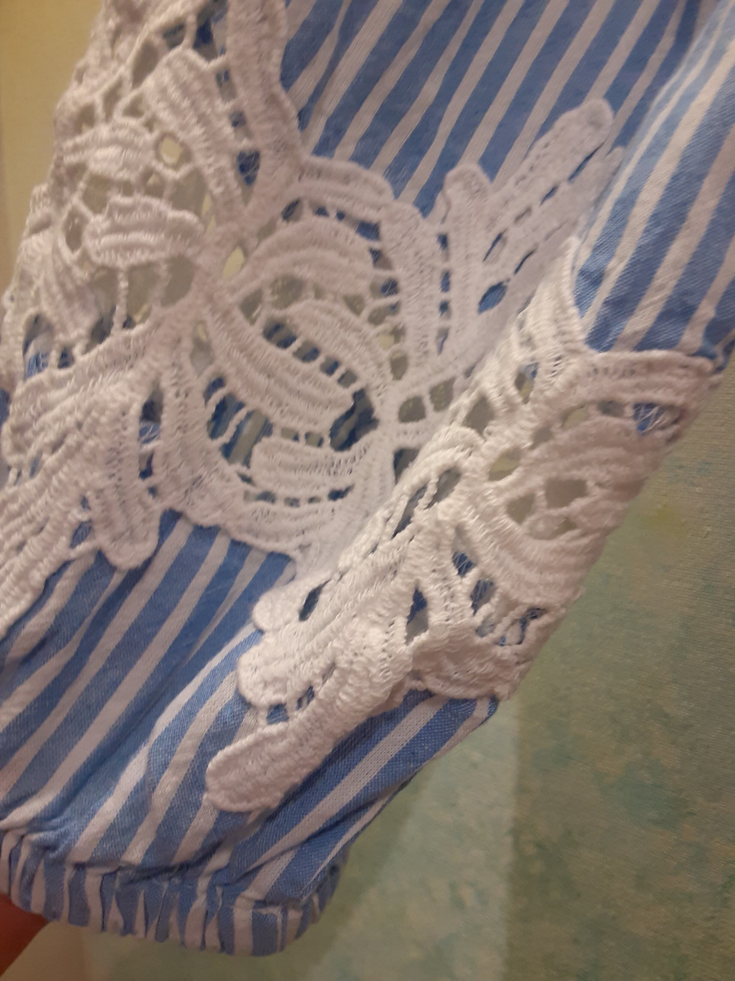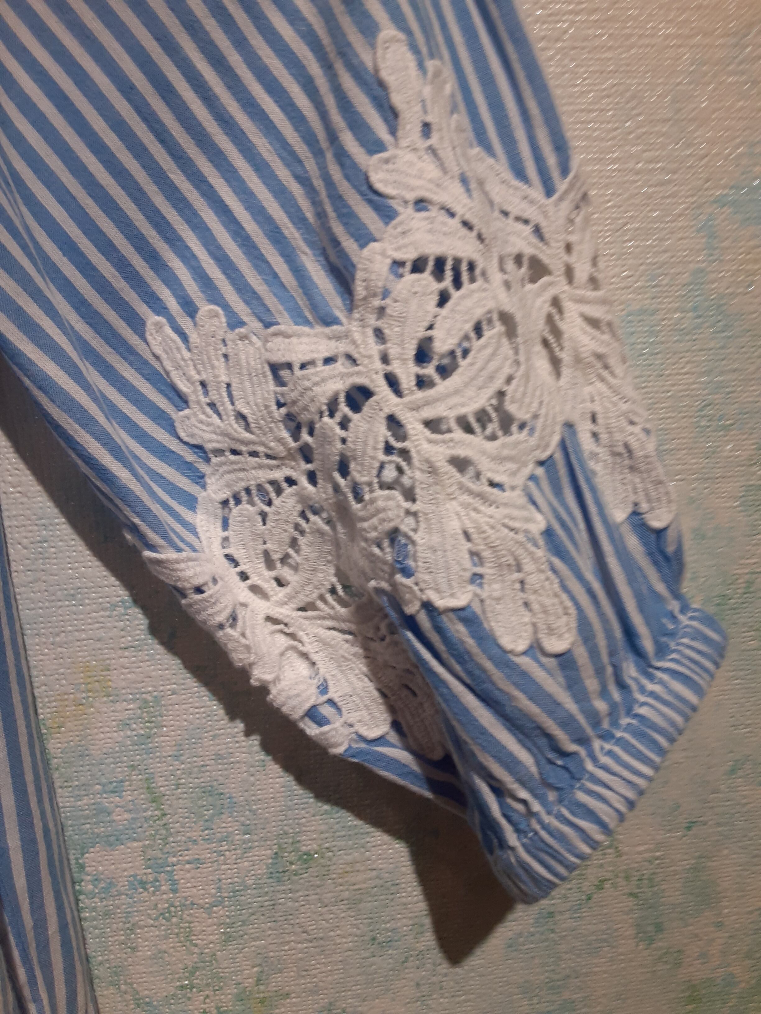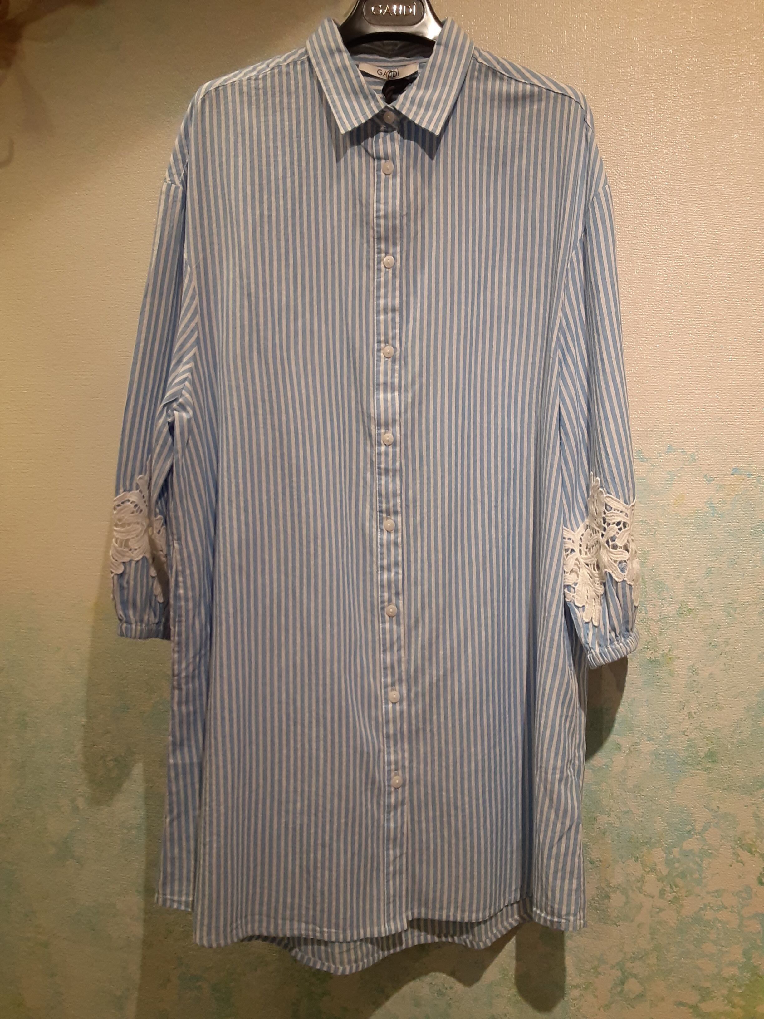 白と水色のストライプのロングシャツ 袖にはゴムが入って少し上にレースが使われ 綺麗めカジュアルに羽織ってみては✨