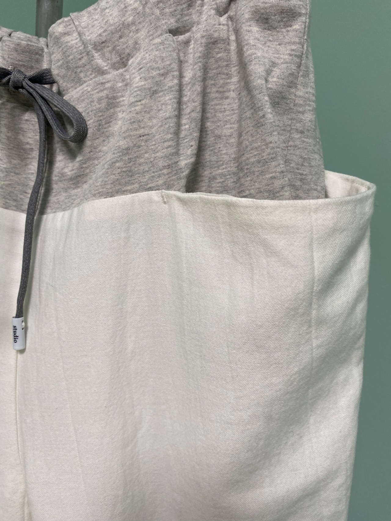 素材感がポイントのカジュアルパンツです。ウエスト部分はゴム仕様で履き心地が良く綿素材とスウェット素材を組み合わせて作っているので、カジュアルさは引き立ちつつも上品な印象も与えます。おうち時間の着用にも最適ですが、アウトドアでのアクティブシーンや、カジュアルな外出にもおすすめです。