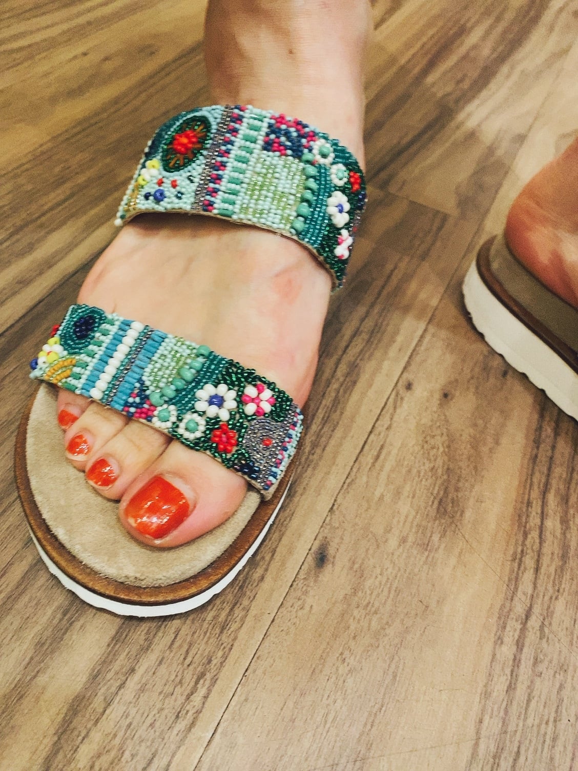 また、ハンドメイド感を生かしながら丈夫さも追求し、長く愛用していただけるように作りました。さりげなく輝くビジューサンダルで、この夏は大人の女性らしい足元を演出してください。