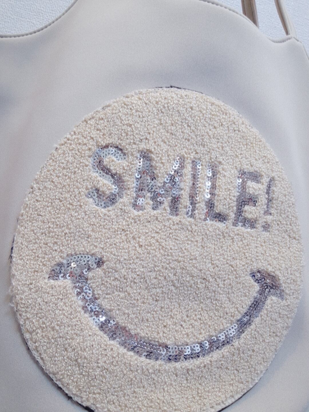 軽くて大容量のGRANDEバッグ。忙しい日常で必要な物をたくさん詰め込めるトートバッグです。華やかなスパンコールで描かれたスマイル☺️が、周りの人々にも笑顔を届けます。