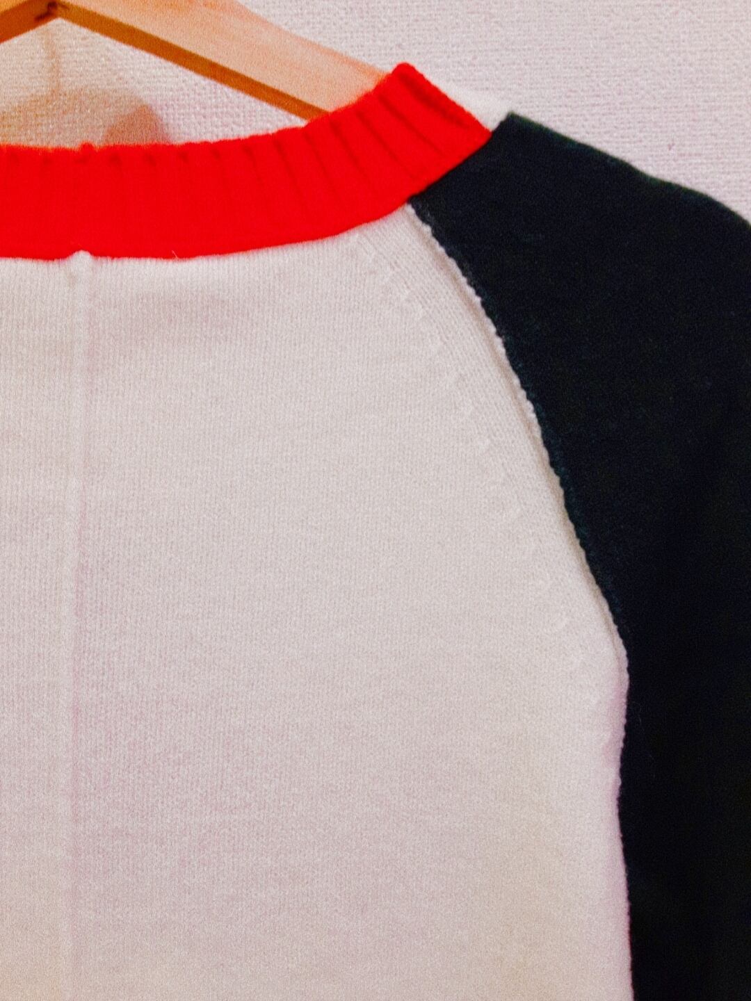 贅沢な色使いが魅力のMAISON HAUSSMANNのセーター。清潔感のあるオフホワイト地に、袖口と襟には鮮やかなオレンジ、肩と腕にはモスグリーンがアクセントになっています。この絶妙なカラーバランスで、他とは一味違ったオシャレ感を演出できます。