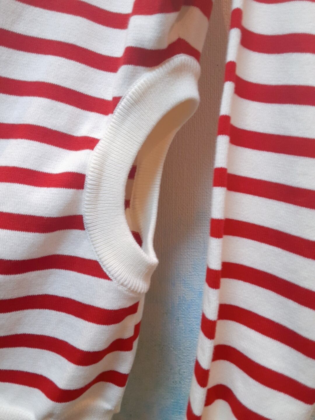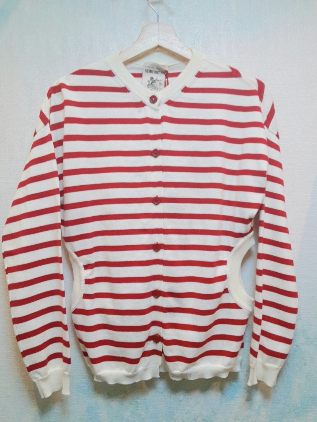 SEMICOUTUREのカーディガンは、赤と白のボーダーデザインが特徴的な一枚です。ウエスト部分には丸い穴があり、おしゃれなアクセントになっています。このカーディガンは、その独自のデザインで他と差をつけたい方にオススメです。